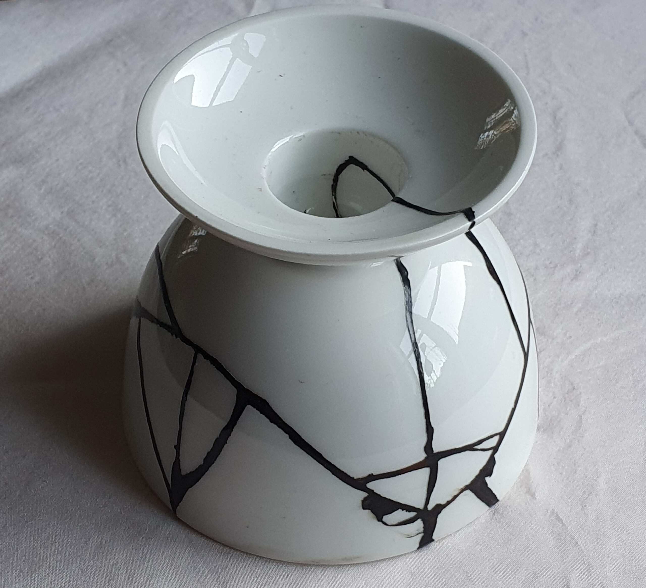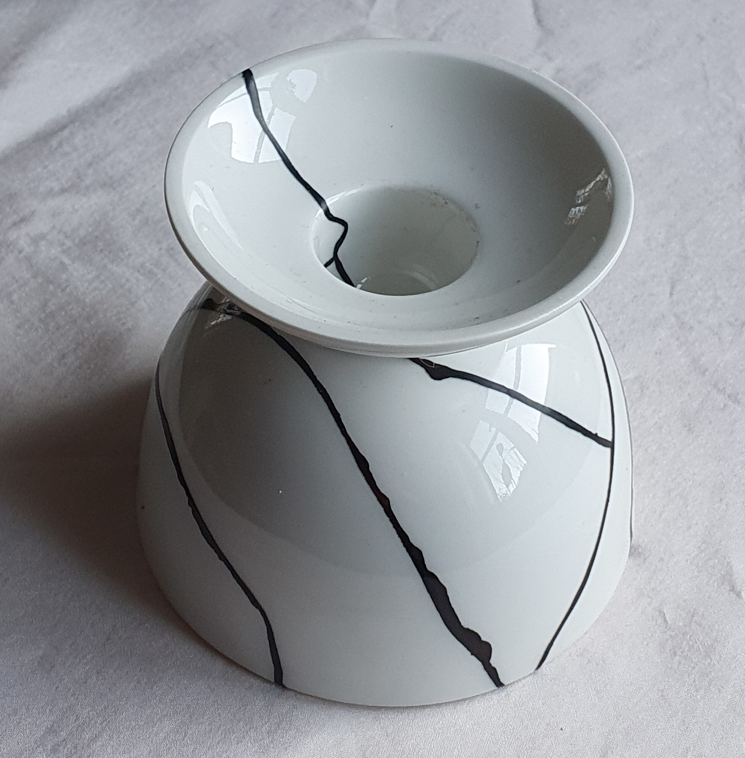 Der Leuchter auf den Bildern ist streng genommen gar keine Kintsugi-Arbeit, weil Kintsugi wörtlich übersetzt „Goldverbindung“ heißt. Ein Finish mit poliertem Lack, wie hier auf dem Bild mit Schwarzlack, nennt man „Urushi Tsugi“. Der Petri-Leuchter von KPM – Königliche Porzellan-Manufaktur Berlin wurde von Trude Petri entworfen und erstmals 1934 aufgelegt. Viele, die ihn zum ersten Mal mit den schwarzen Lacklinien sahen, waren ganz verblüfft, als sie hörten, er sei ein repariertes Objekt. Sie hatten das schwarze Muster für sein ursprüngliches Design gehalten.